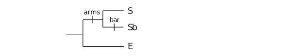 with in both cases “0” meaning absence and “1” presence. According to the Jean’s law, then “0” for the arms is the ancestral state. There is no obvious polarization for the character bar. The matrix describing galaxies is thus: