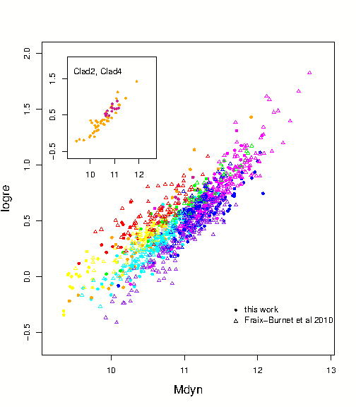 Secondly, the three plots below show the radius versus the mass. On the left plot the colors correspond to the de Vaucouleurs morphological classification index T. On the right plot the colors correspond to a multivariate classification, this one obtained with cladistics. The third plot below is the result of a numerical simulations showing different evolutionary scenarios, the colors indicating the redshift of the last major merger and the dispersion within each colors corresponds to various initial conditions (masses, quantity of gas, impact parameters of the collision). The references are Fraix-Burnet et al 2010, 2012 and Robertson et al 2006.